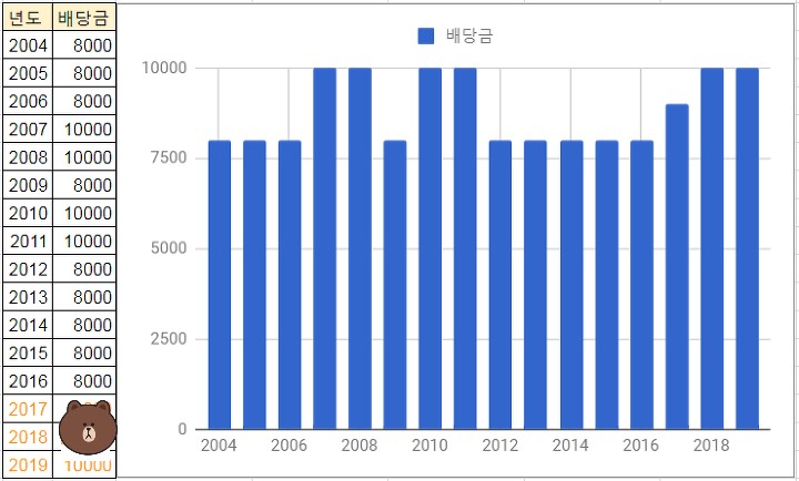 아래 표는 신한지주의 2004년부터 2019년까지 배당금과 시가배당률 추이를 그려봤는데 역시 2008년 금융위기는 못 피했네요.