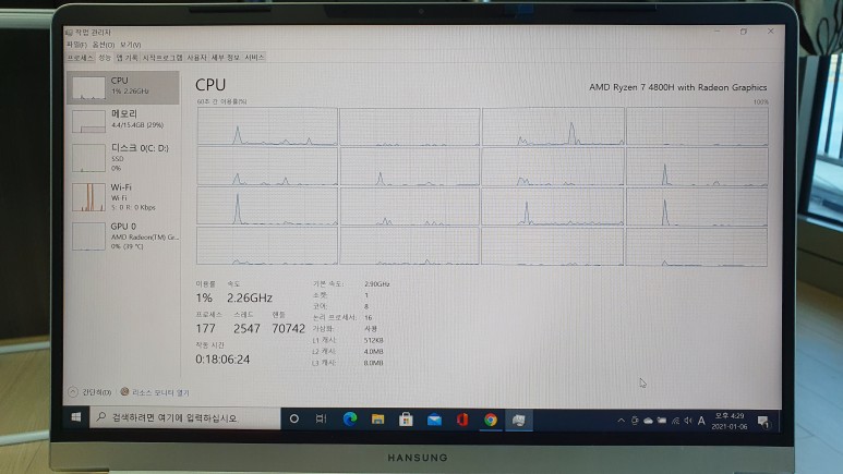 그래픽카드(GPU)는 AMD에서 만든 내장 그래픽이고 중앙 처리 장치(CPU)는 라이젠 7 4000시리즈입니다. 이제부터 기대감이 더더욱 커집니다. R7-4800H은 거의 괴물급이죠. 8코어 16스레드를 가진 알찬 놈입니다.