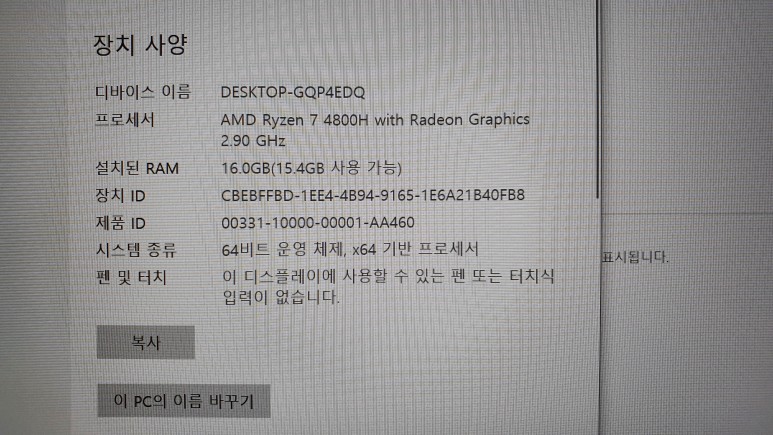 내컴퓨터 속성 들어가서 보면 라이젠7-4800H, 16기가 램 이 설치된 모습을 보실 수 있어요. 이 정도면 외장 그래픽카드 없이 오버워치나 롤 정도는 무난하게 돌아가요. 저는 게임보다는 유튜브, 엑셀, 파워포인트 작업 위주로 하다 보니 차고 넘치는 스펙이죠.