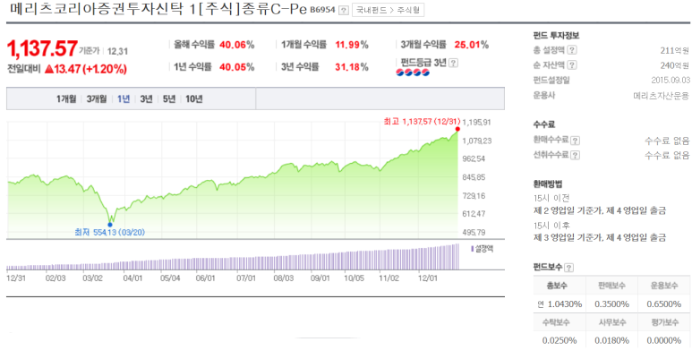 보유 중인 상품의 정식 명칭은 메리츠코리아증권투자신탁입니다. 물론 연금계좌 전용이고요. 11월 말일 기준가는 1,015.75로 작년 연말 대비 30%가량 성장한 모습인데 계속 성장을 하고 있어요.