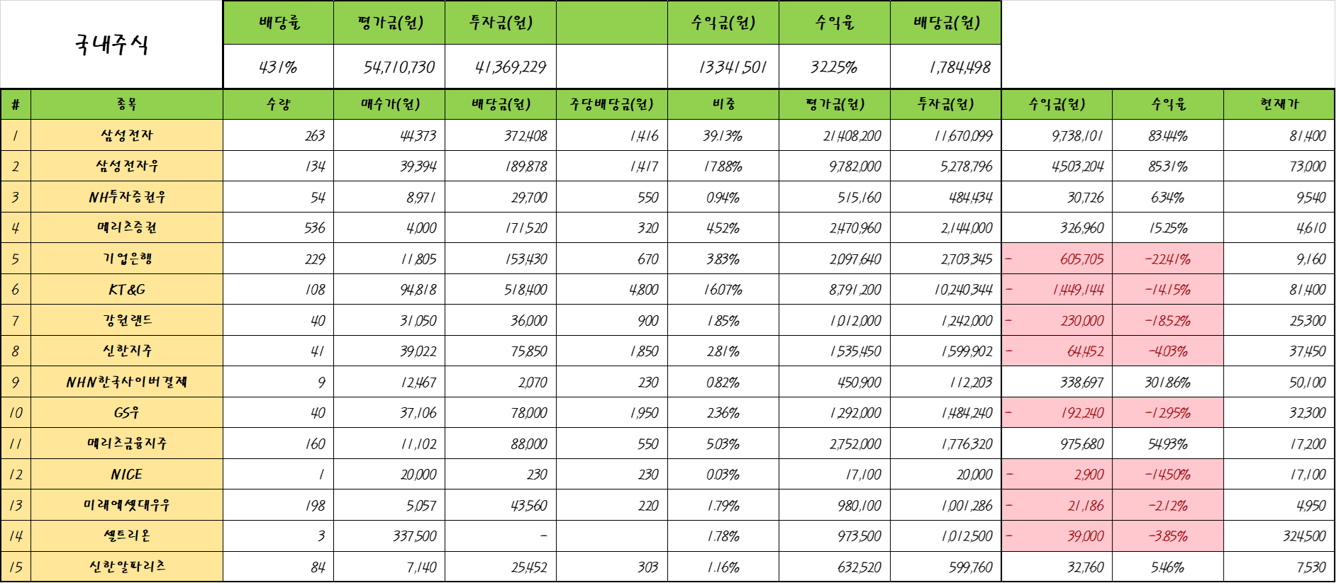 요즘은 주식에 많이 소홀해진 기분입니다. 드디어 주식의 오르고 떨어짐에 무관심해지는 단계가 되어가는 건가 봅니다. 계속 멘탈이 좋아지는 것 같아 주식이 오르는 것보다 더 좋은 경험을 하고 있다고 생각해요. 앞으로도 영원히 주식을 보유함으로써 자산을 늘리고 추후에 부동산을 매입할만한 시기가 온다면 부동산도 매입해서 평생을 재밌고 행복하게 살아보고 싶어요. 세상의 흐름과 전혀 관계없이 오직 행복한 인생을 스스로에게 선물하면서 그렇게 살아가는 게 너무 좋은 거 같아요. 꼭 이룰 수 있도록 노력하겠습니다.