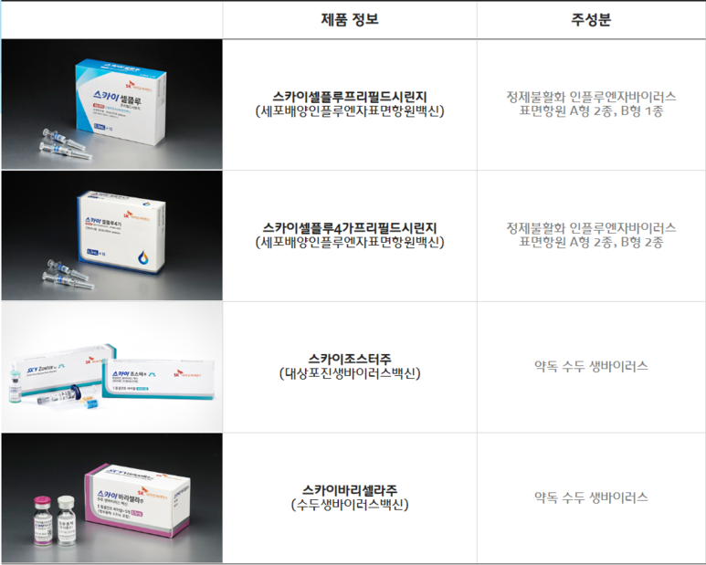 그 이후 스카이조스터주(대상포진생바이러스백신), 스카이셀플루4가프리필드시린지(독감백신), 스카이셀플루프리필드사린지(독감백신) 등을 만들어 내며 성장해왔고 이 번에 상장을 준비하며 2021년에 상장을 목표로 하고 있어요.