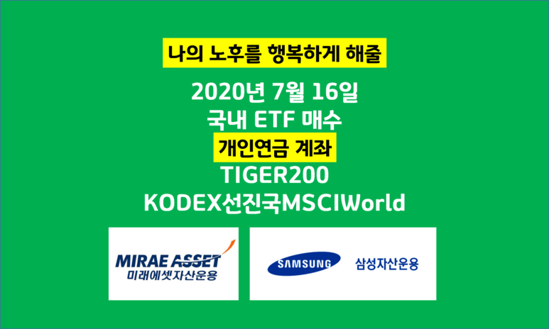 나의 처음이자 마지막 개인연금 계좌에 7월에도 40만을 납입해서 매수했어요. 물론 깜빡하고 저번 달에 매수를 못해서 이번 달은 약 80만 원 정도 매수한 셈이 돼버렸죠. 무엇을 담을까 생각하다가 결국은 우리나라에 투자하는 TIGER200과 미국을 포함한 선진국에 투자하는 KODEX선진국MSCIWorld를 주워 담았어요.