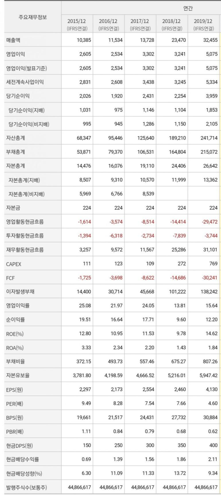2019년 자산총계는 552조의 규모로 엄청납니다. 하지만 부채 포함이니까 자기 자본은 42조네요. 그래도 큽니다.