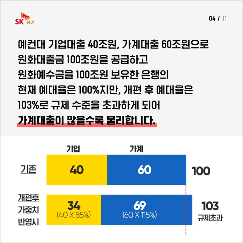 기업대출보다 가계대출이 큰 시중은행의 입장에선 똑같은 15%라도 타격을 받게 되지요.